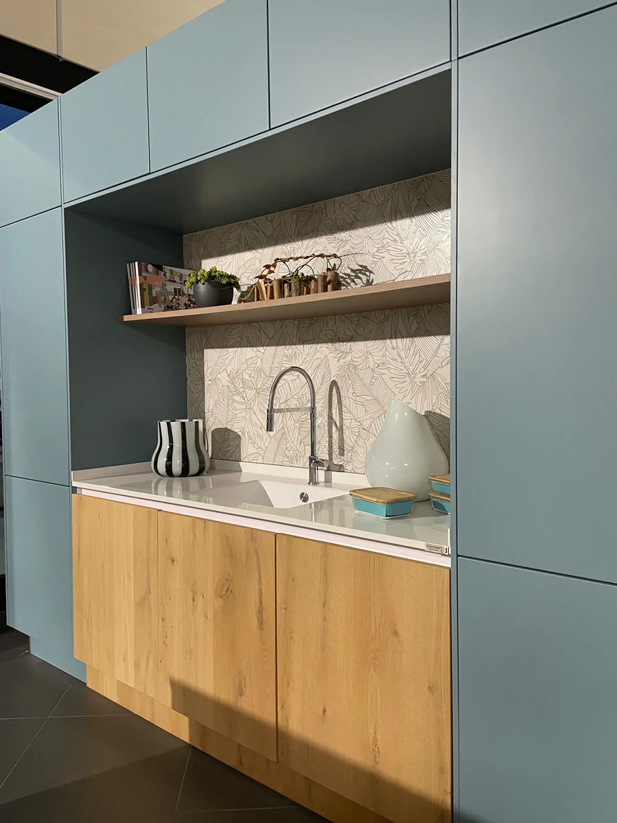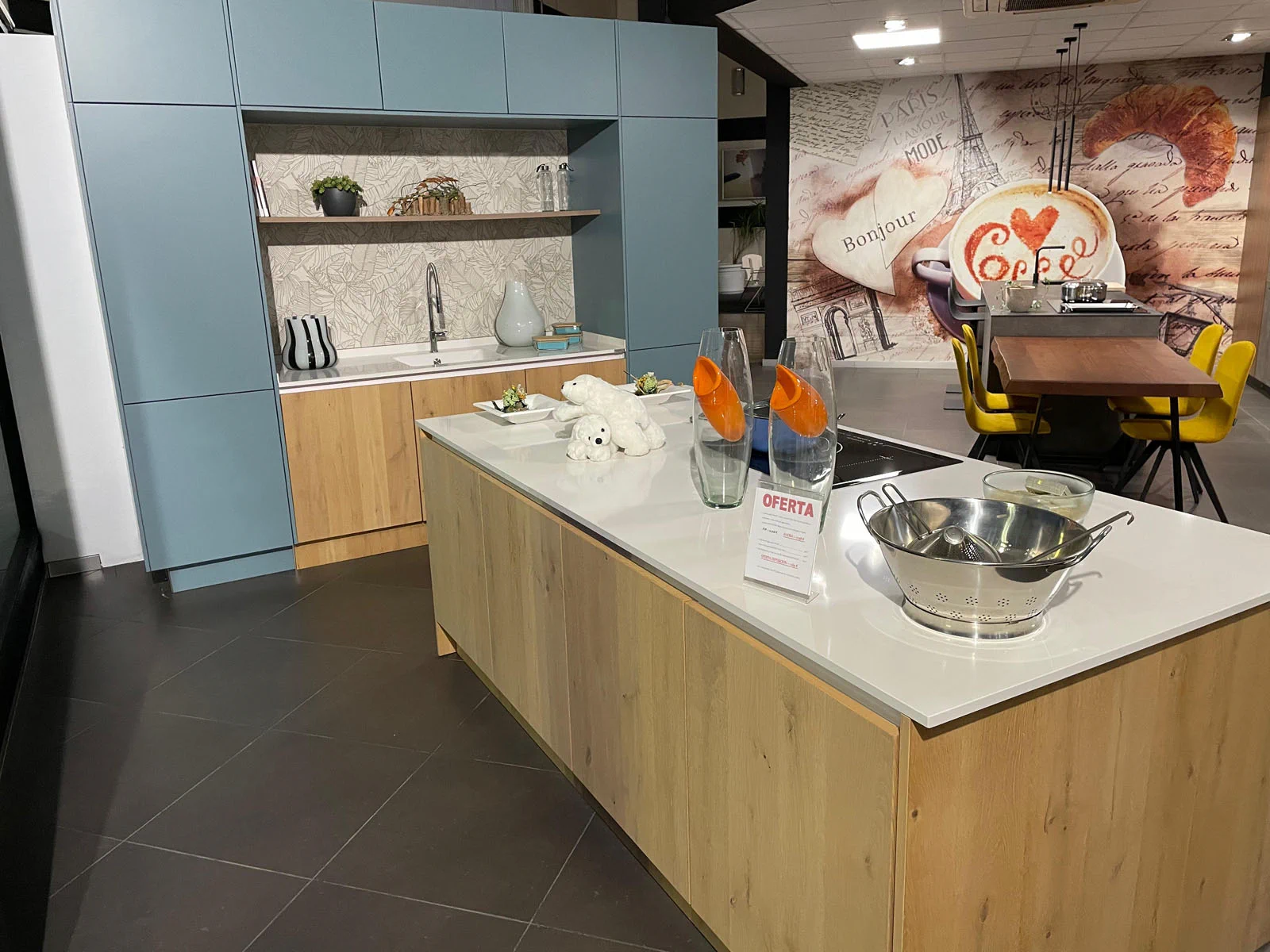 Cocina modelo DAKAR de madera natural Roble Claro Vela con gola blanca combinado con laca color azul agua marina.